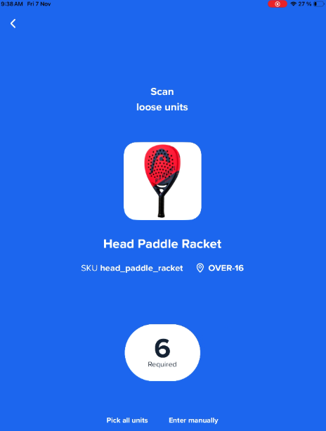 - On the Scan loose units screen, scan the SKU barcode for each individual item until the "Picked" count matches your physical count.