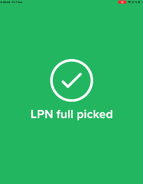 - The app will confirm LPN full picked. The LPN quantity is automatically deducted from the total required for that location.
