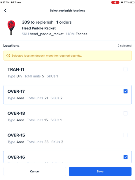 - If you select locations that do not contain enough stock to meet the total required quantity, the app will display a warning: "Selected location doesn't meet the required quantity." You may continue if necessary.