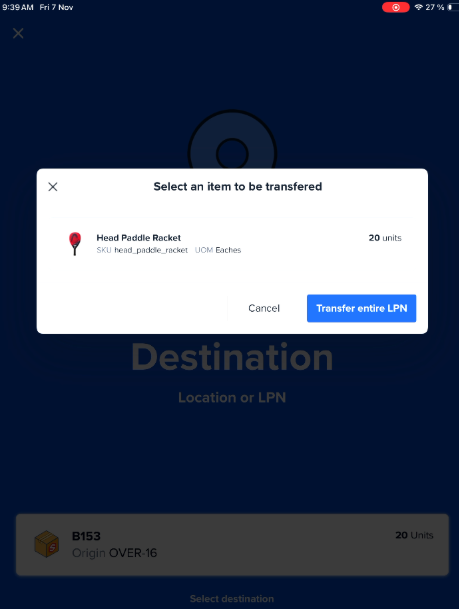 Tap Transfer entire LPN to confirm the move of the LPN: