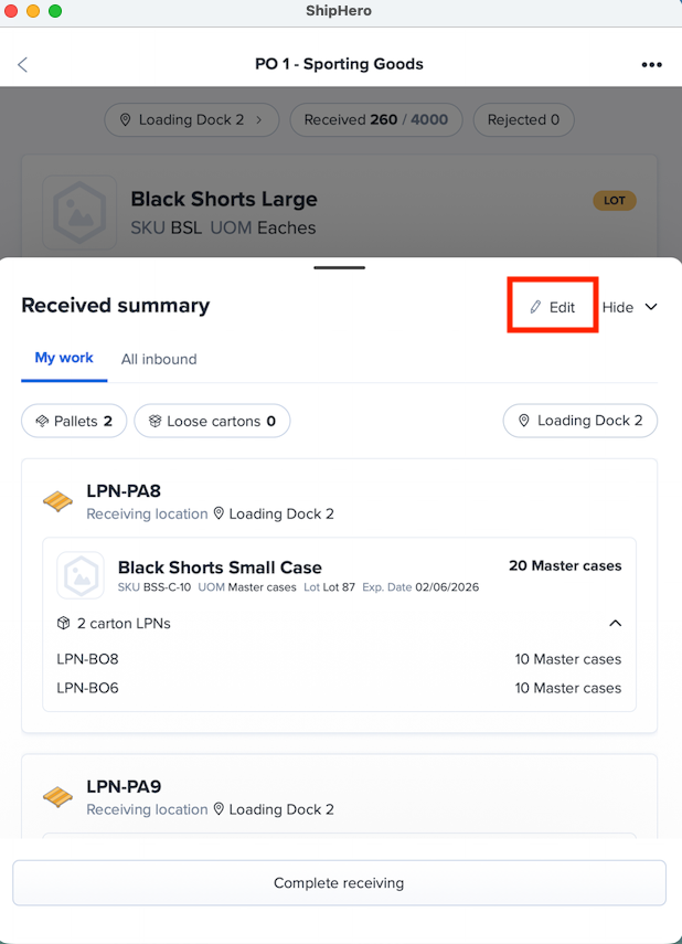 Editing how cartons are palletized or the quantities received is easy to do from the Receiving Summary.