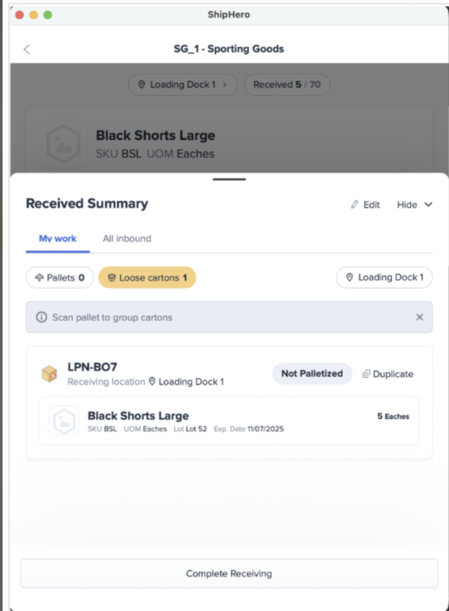 - All loose cartons will be nested under that pallet and show in the Received Summary accordingly.