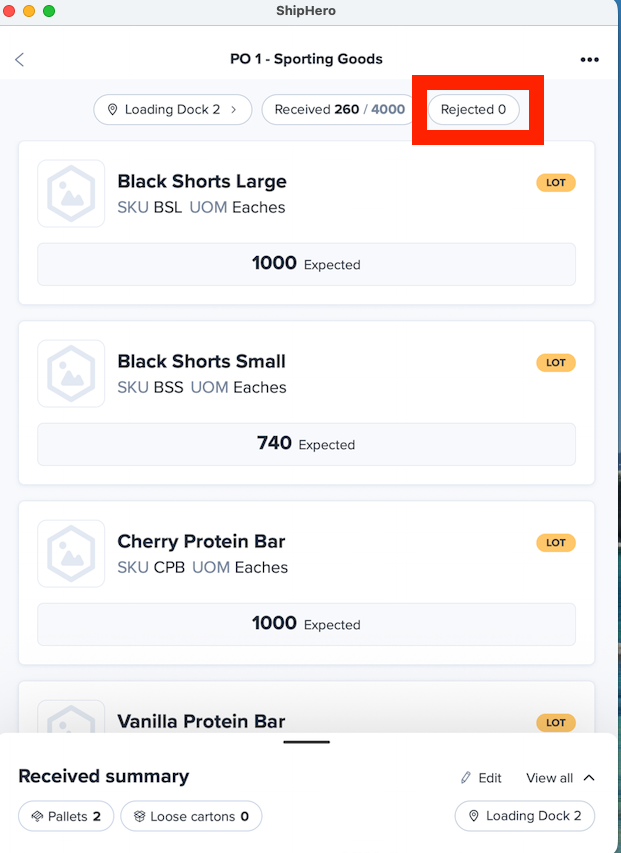 - In the mobile: View the Rejected counter at the top of the Inbound Shipment.