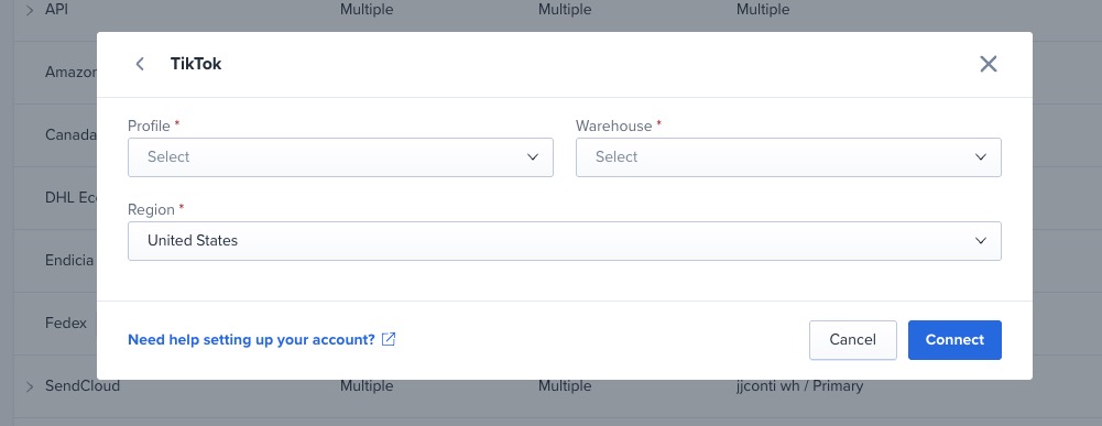 IMPORTANT NOTE FOR 3PLs: Because TikTok carrier connections are specific to the store, they must be set up at the client level. To use carriers connected at the client level you must enable the Use Customer's Shipping Accounts setting on the 3PL page.