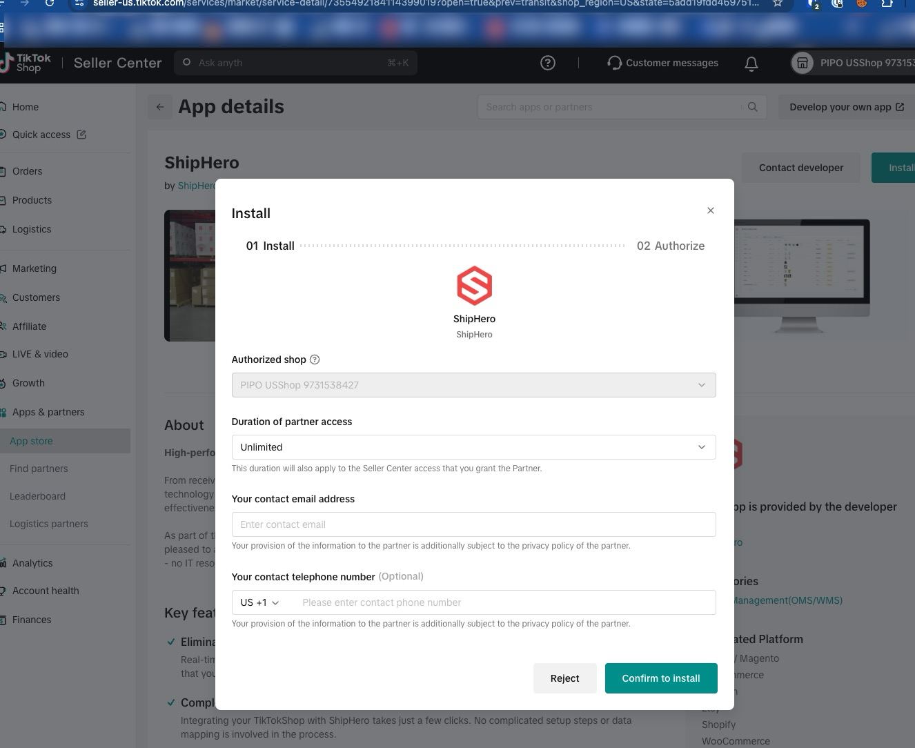 TikTok: ShipHero install page example