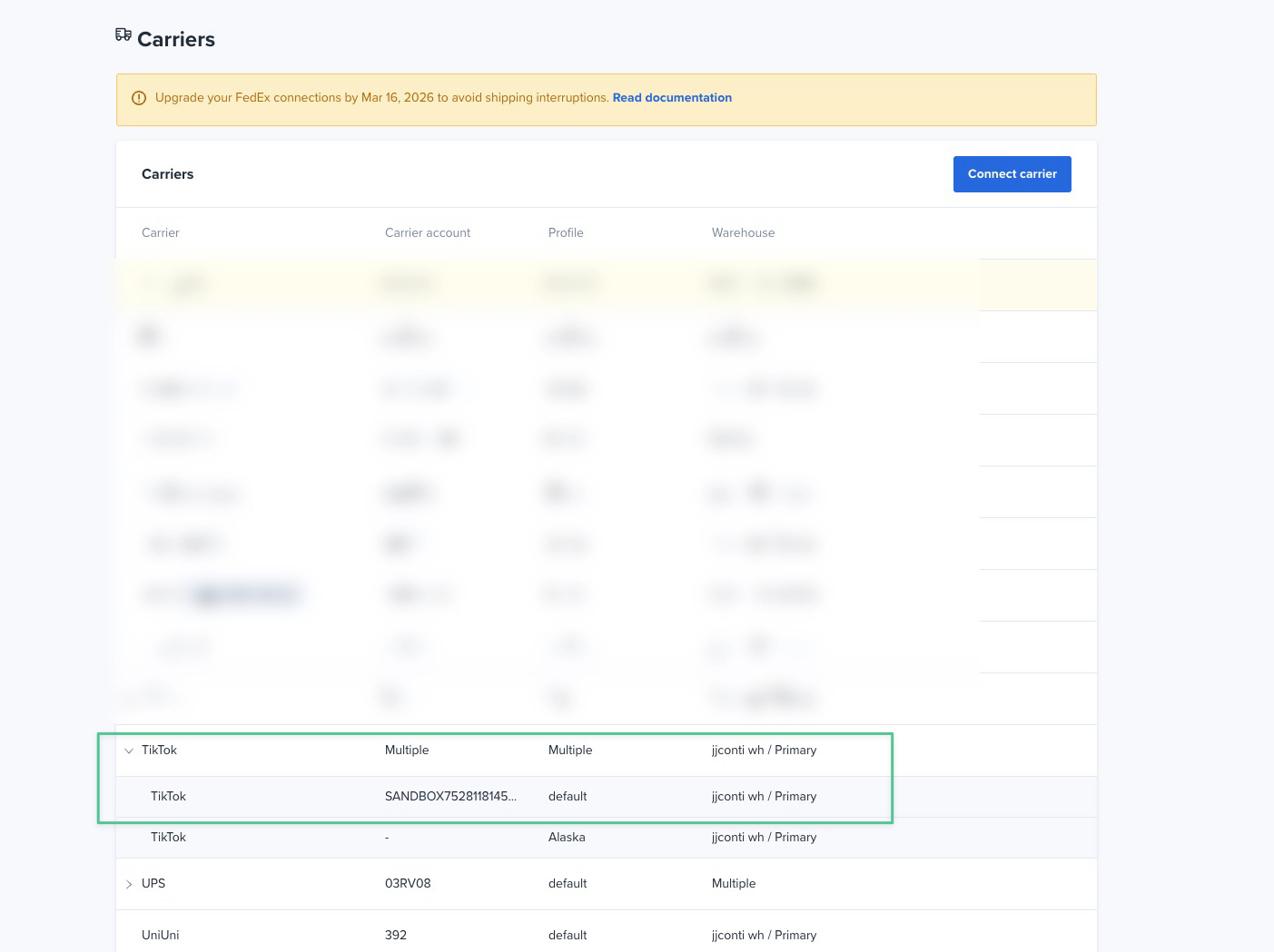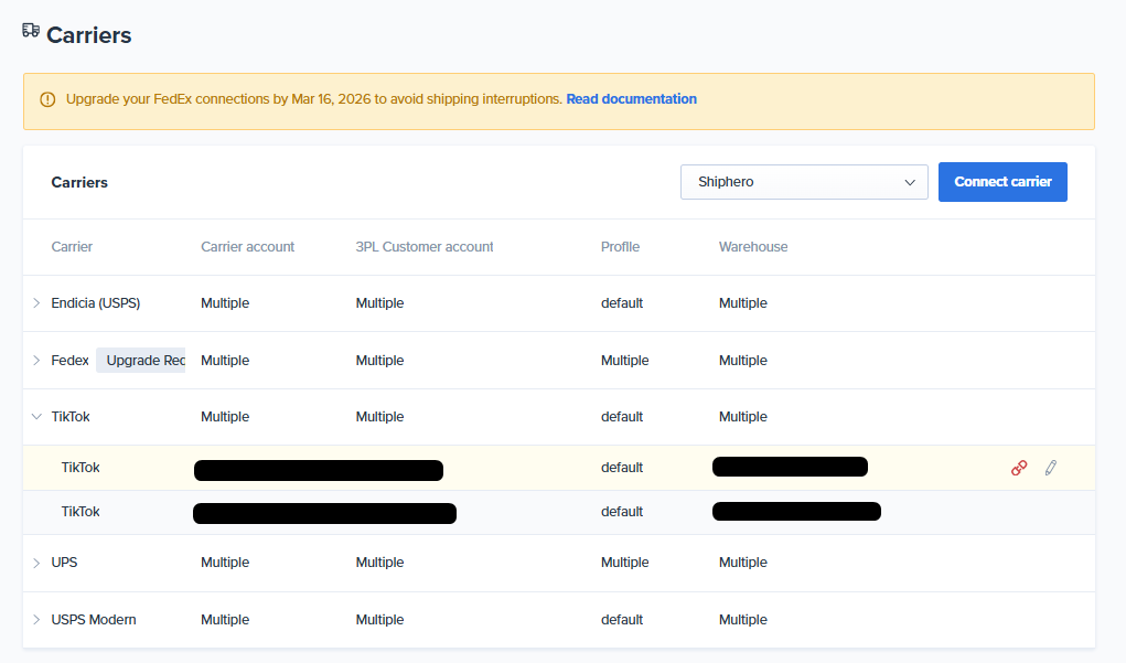 Go to My Account > Carriers to check the connected carriers list. Expand the TikTok line to confirm TikTok is connected to the proper store name, profile and warehouse. If you don't see TikTok connected as a carrier, please follow the steps below to Add TikTok as a Carrier in ShipHero. Once finished move on to Step 2.