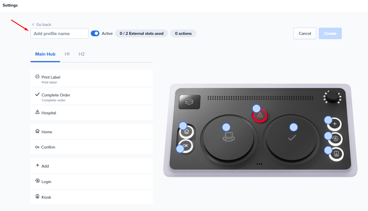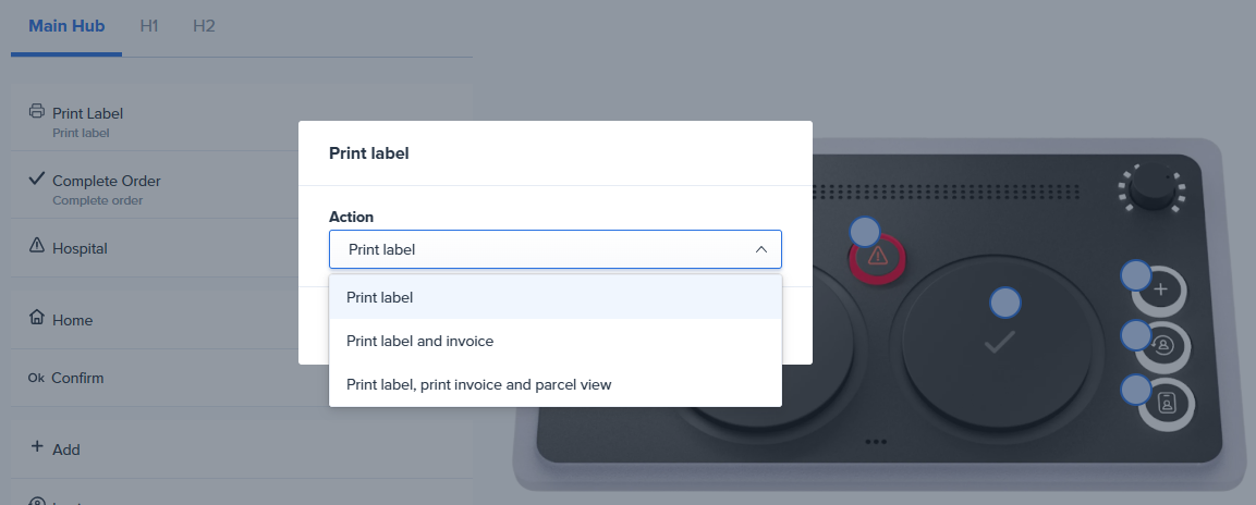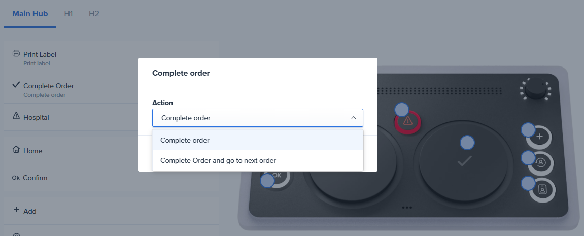 Configure the Main Hub Buttons: The Main Hub has 8 built-in buttons. The following are pre-set and cannot be changed (Home, OK, Hospital, Add, Login, Kiosk). Map the Print Label and Complete Order buttons to match your workflow.