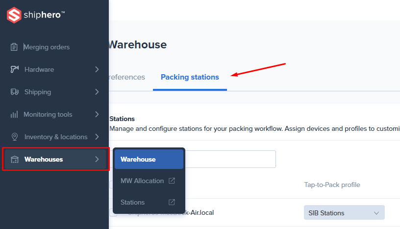 - Select Warehouses > Warehouse settings and select the tab labeled Packing stations.