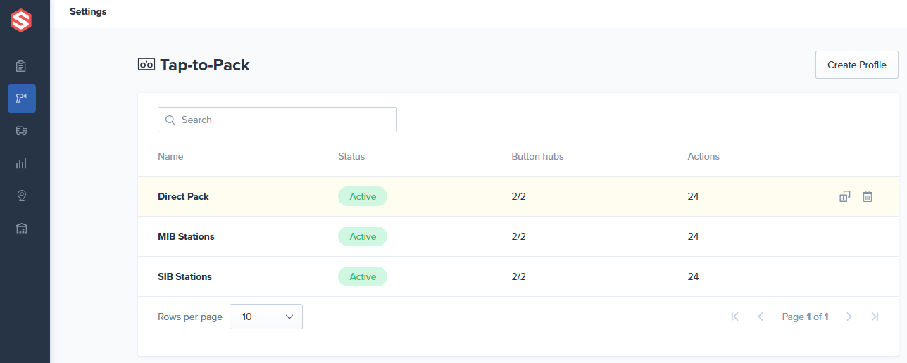 - Activate/Deactivate: Toggle a profile on or off. Deactivated profiles are saved but not available for selection at packing stations. Profiles are set to "Active" by default when they are created.