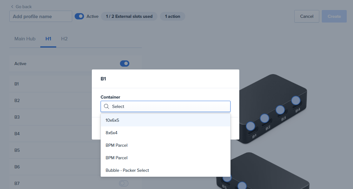 Configure the Box Button Hub Slots: Use the H1 or H2 tabs to configure the Button Hub slots respsectively, H1 for Hub 1 and H2 for Hub 2. Each slot on either hub can be mapped to an active shipping box.