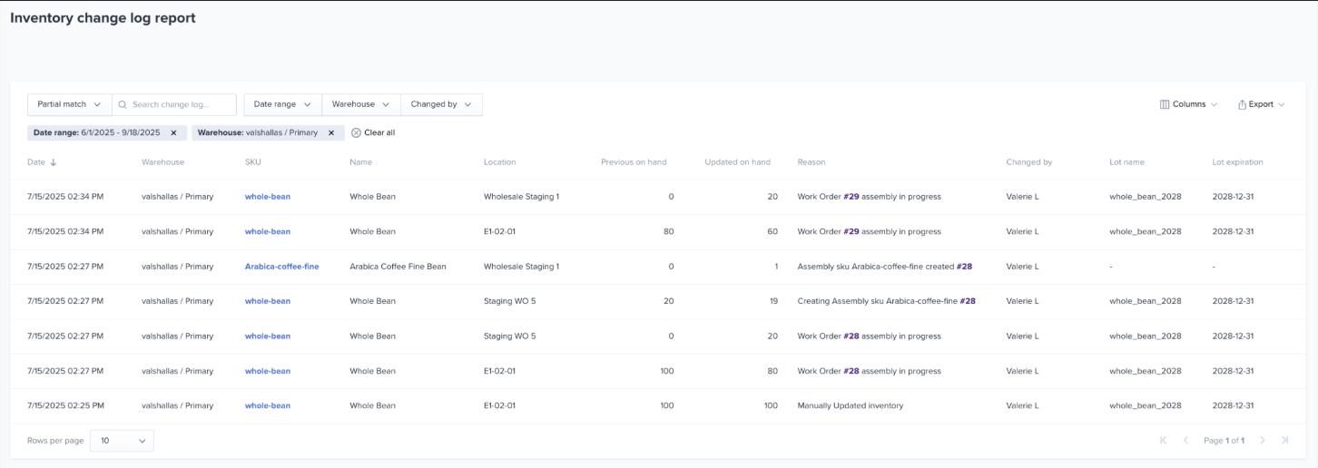 The Inventory Change Log provides a detailed history of changes made to inventory levels within a warehouse. This report helps you track adjustments, assemblies, returns, and other inventory movements with full visibility into who made the change, when, and why.