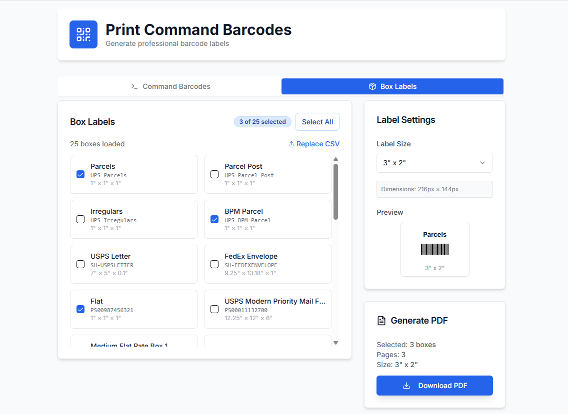 Want to print your barcodes on a label? Only need specific ones? Want to print box barcodes to a specific label size? Use this platform to Generate Professional Barcode Labels needed for your processes.