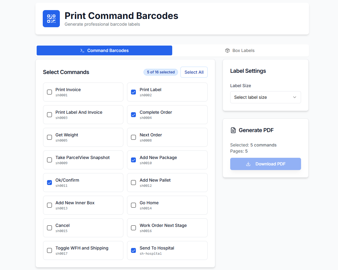 Easily pick and choose the command barcodes that are relevant to your operations and print them to the desired size.