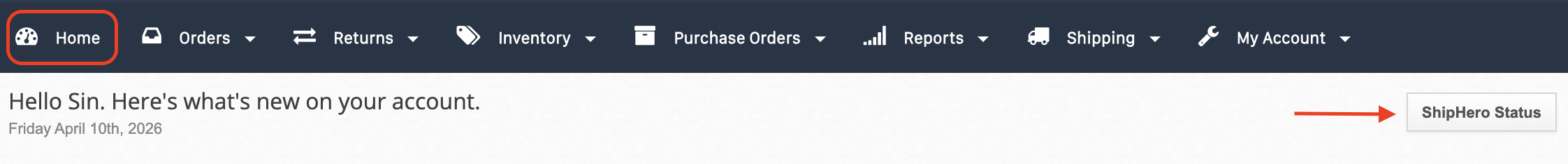 If you are experiencing performance issues and want to verify the current operational state of the platform, you can access the status page directly from your account. Navigate to your ShipHero Dashboard (or Home on the top menu) and click the ShipHero Status button to view the live report.