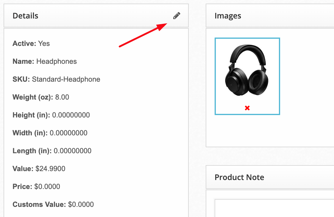 - Click the Pencil Icon in the Details section to open the product's editing module.