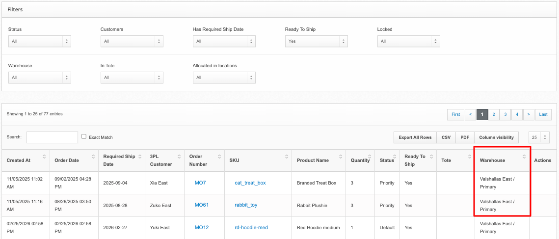 - On the Orders > Manage Order page, you can also filter by warehouse or see if an order is allocated to ship from multiple locations.