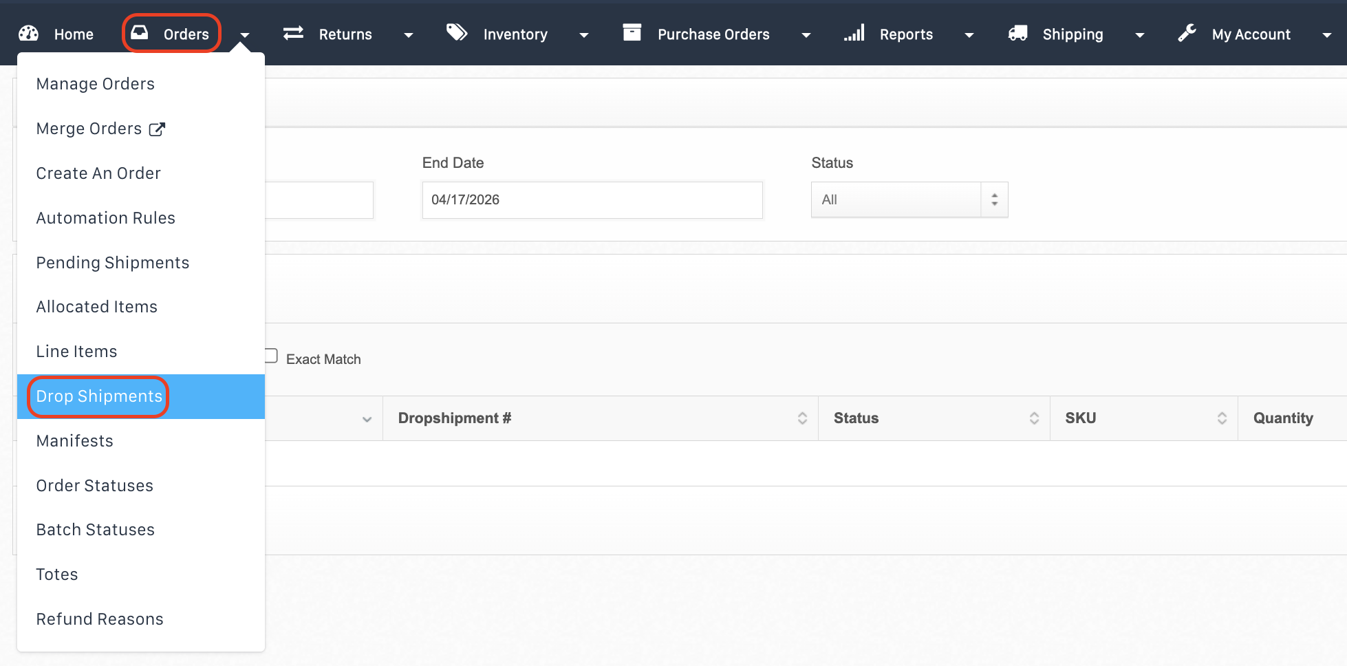 To view the status of all current and past drop shipments, navigate to Orders > Drop Shipments. This view allows you to search for specific shipments, check completion statuses, and update records as needed.