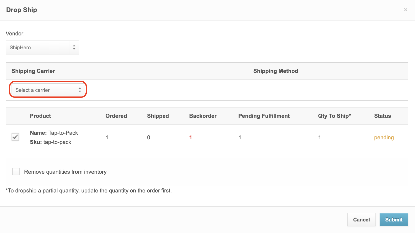 To initiate a drop shipment for an existing order, follow these steps in the Dashboard: