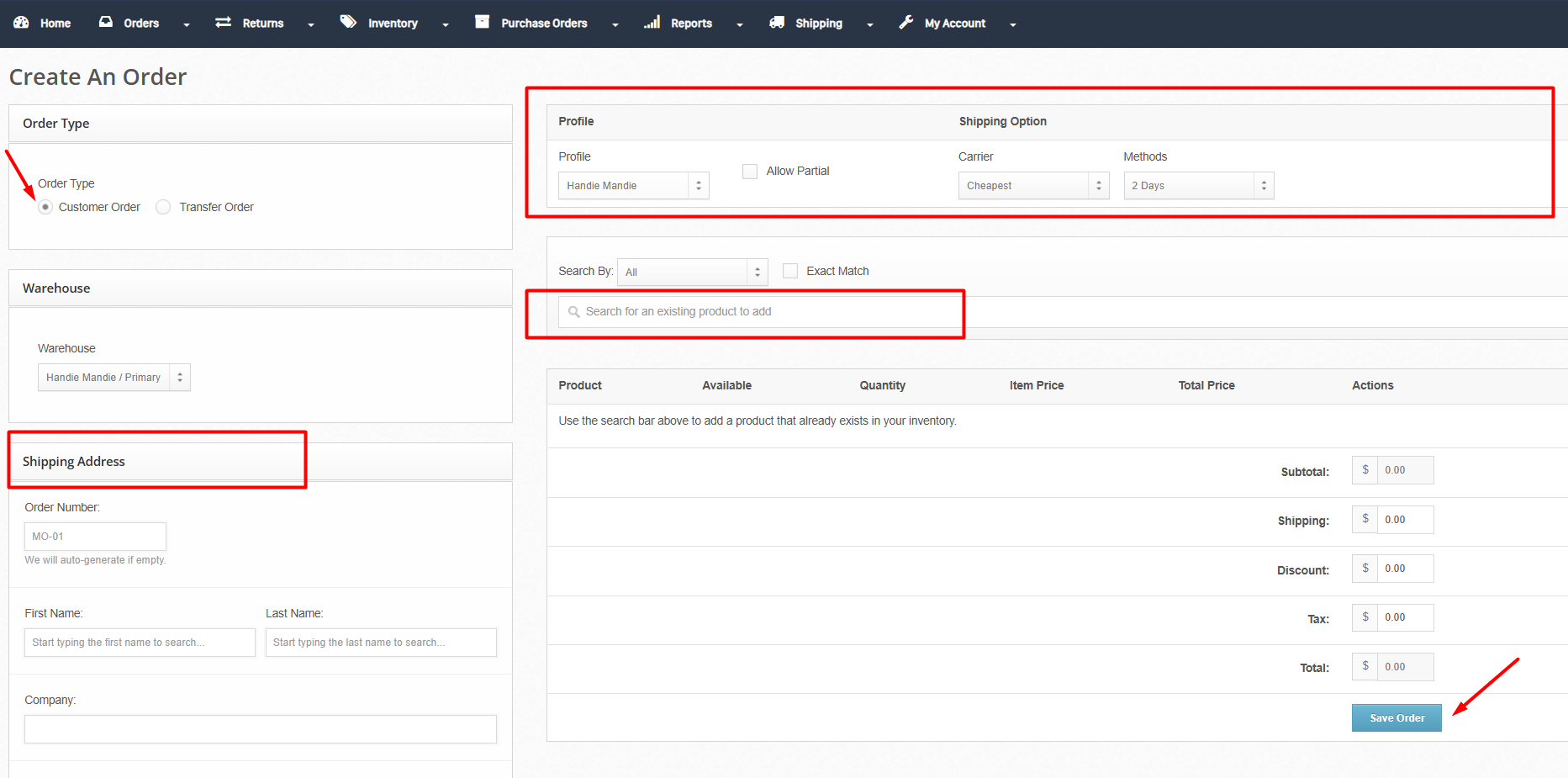 - For Multi-Warehouse Accounts: Select the warehouse you want to create the order for. Note: MWA rules can overwrite this selection based on the triggers in place. If you use tags as your MWA Rule triggers, you will need to add a tag after the order is created and then reprocess the order. To learn more about MWA Rules, see How to Use MWA Rules.