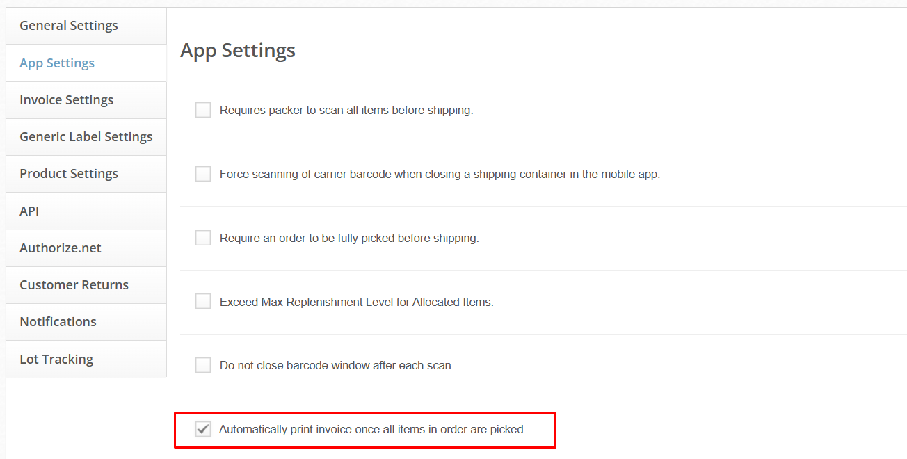 - Locate the setting Automatically print invoice once all items in order are picked.