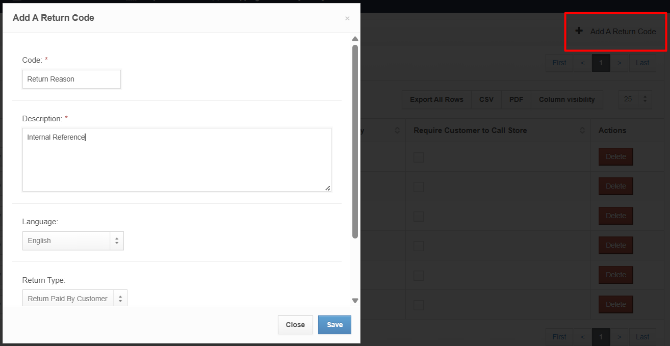 - Go to the Returns > Return Codes page and click the Add A Return Code button.