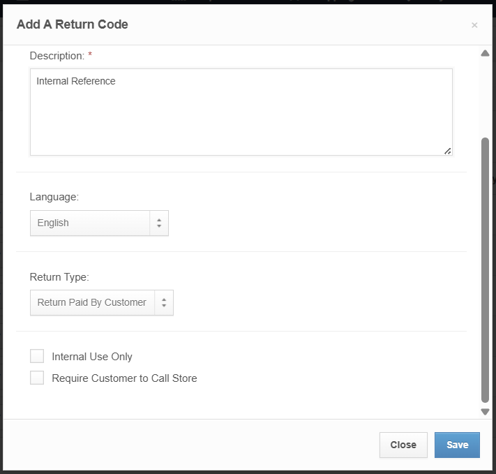 | Require Customer to Call Store | When Enabled the end customer will not be able to generate a self return on the store platform return page if that code is selected. They will recieve a prompt telling them to contact customer service for assistance. This is useful when you need more information from a customer for example if they are trying to return a damaged or defective product. |