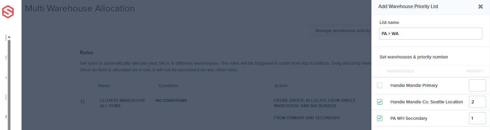 - Check the warehouse you want to include and assign the priority they hold over one another.