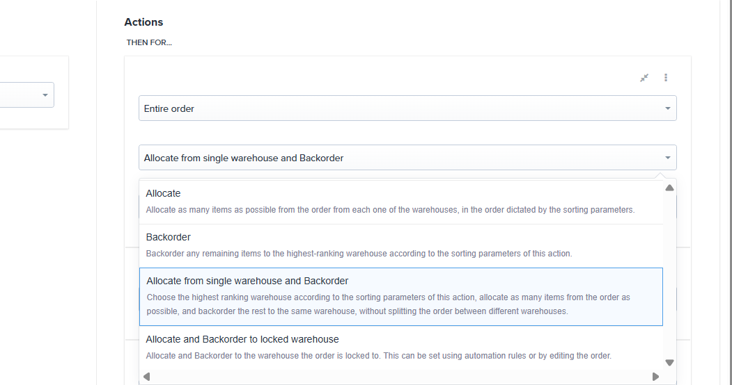 - Allocate: This action tells the system to allocate items to a warehouse based on a defined sorting method. When using this action you also need to define which warehouse to backorder the remaining unallocated items on the order in the same rule.