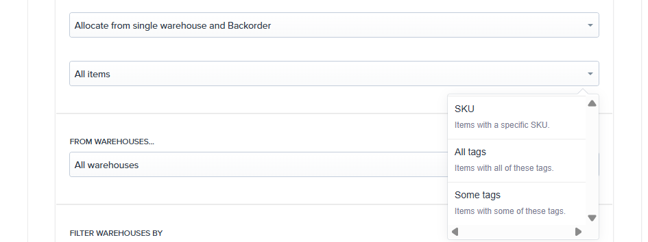 Allocate and Backorder to Locked Warehouse: This allocates and backorders items to the warehouse that the order is locked to which is set using automation rules or via the API. Here is an example of this is set up, Using Shopify Locations as a Trigger in Automation Rules.