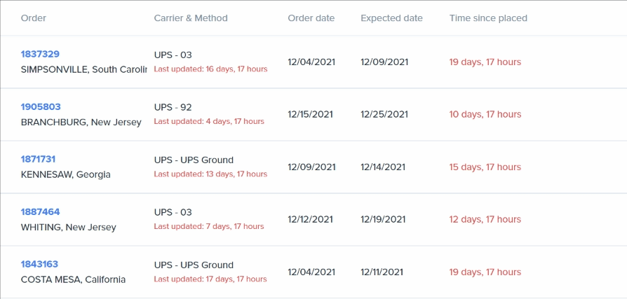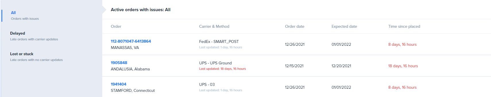 Lost or Stuck | Order was shipped but not delivered, and the last carrier update was more than 2 days ago. An order remains “stuck” until the carrier updates it or the user marks it as resolved. |