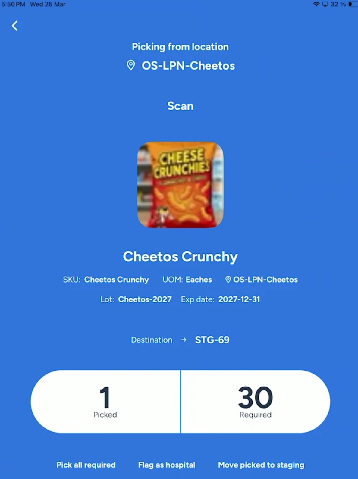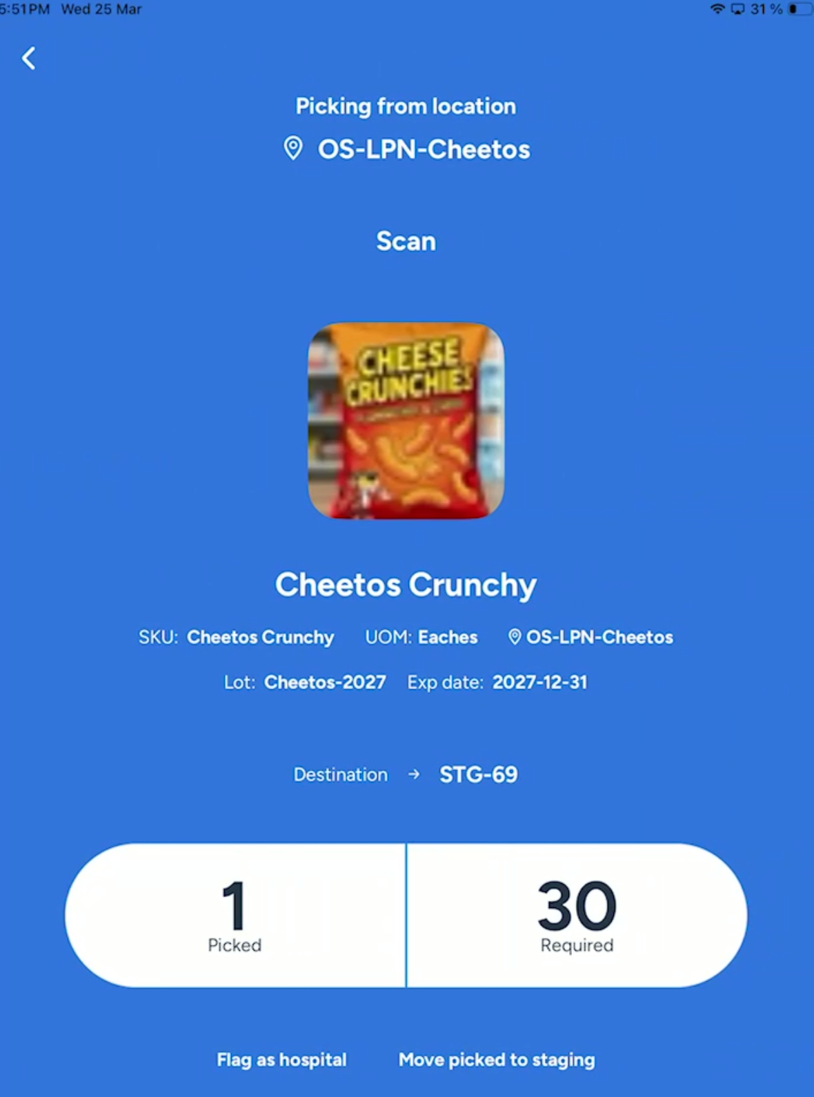 Scanning Setting Operational Impact Mandatory Disables manual entry, "Pick all units," and "Pick all required" buttons. Users must scan each SKU. Optional Enables manual entry and "Pick all" buttons for faster, non-enforced picking. With Mandatory scanning enabled Without Mandatory scanning enabled