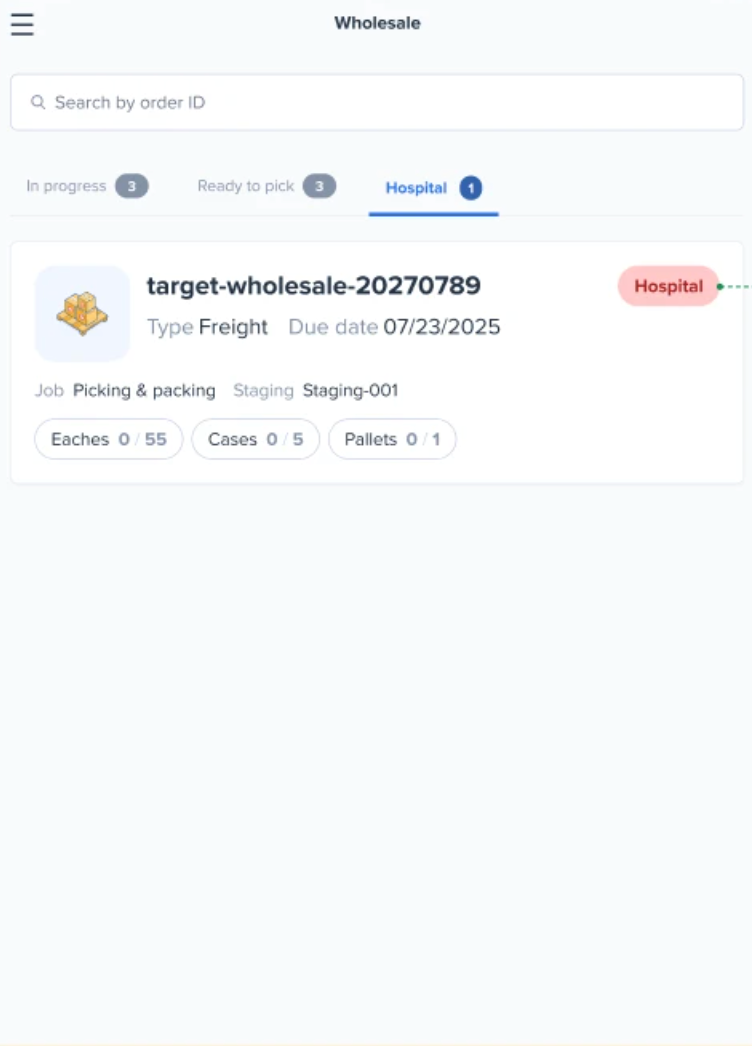 If there is a problem in a location when picking a wholesale order, the picker can mark the location as Hospital. By marking the location as Hospital, they are able to asycronously communicate an issue with an order and continue picking another assignment.