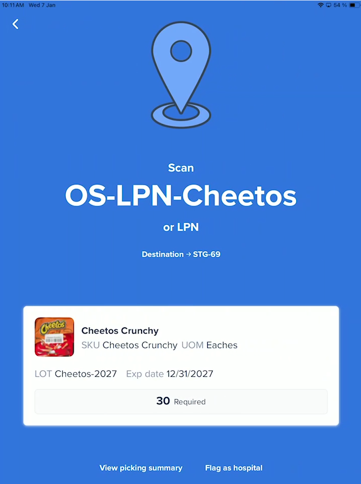 Example pick list - LPN Scanned User navigated to LPN confirmation page Scan the Location first (Traditional flow): Scanning a Location Barcode prompts the user to either Scan an LPN or Scan an Item.