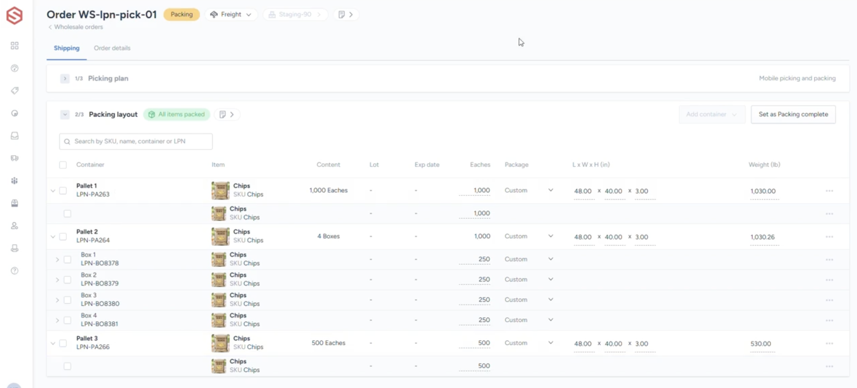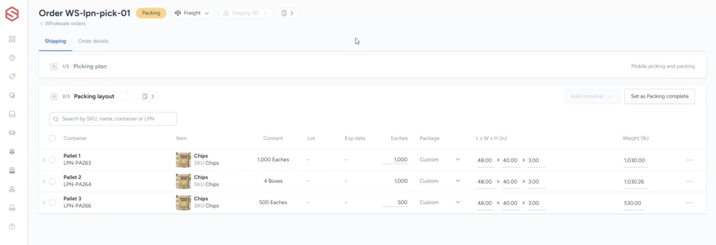 - Full LPN Pick: If the quantity of a SKU within an LPN is more than or equal to the required amount on the wholesale order, the system processes the full LPN automatically. Inventory remains assigned to the LPN and the entire LPN moves from the Source location to the Staging location and reflected in the Packing Layout.