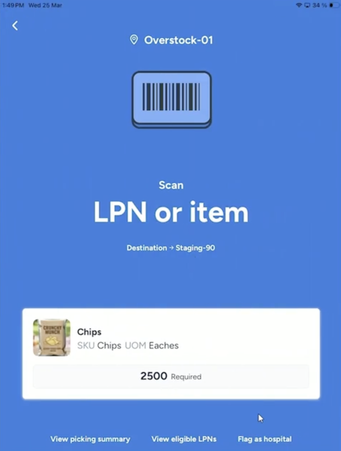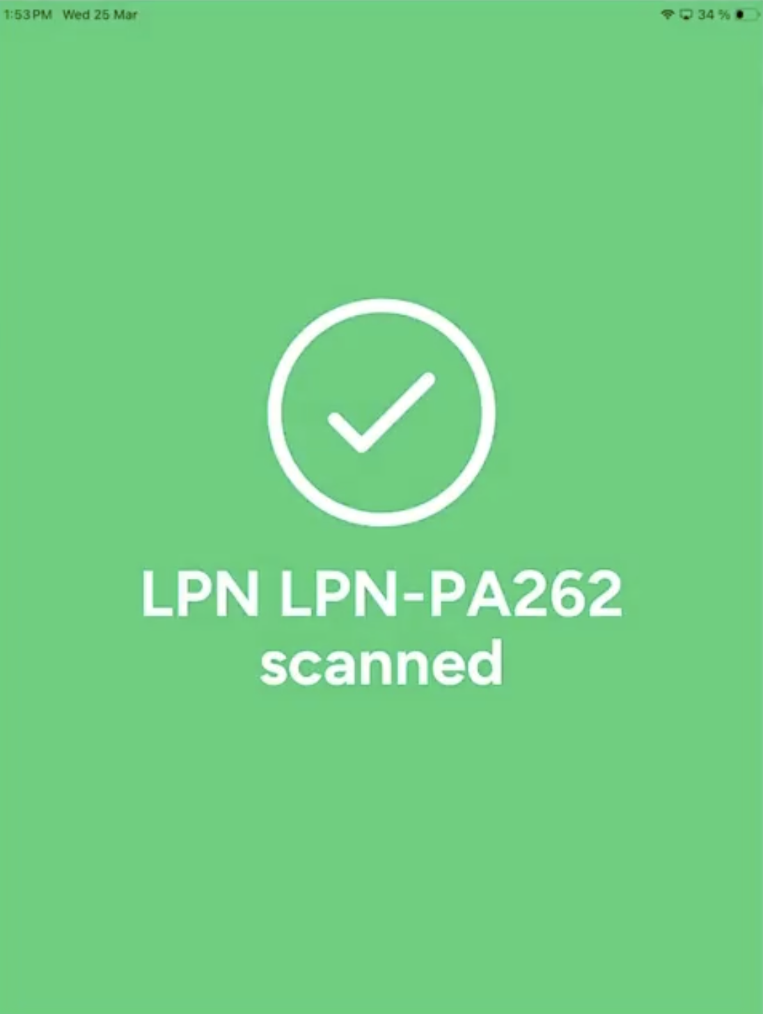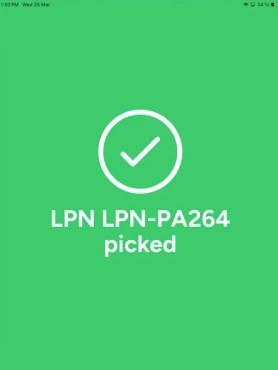 - Partial LPN Pick: If the quantity of a scanned LPN exceeds the required amount on the whoelsale order, the user will be instructed to scan/enter the quantity they are removing from the LPN.