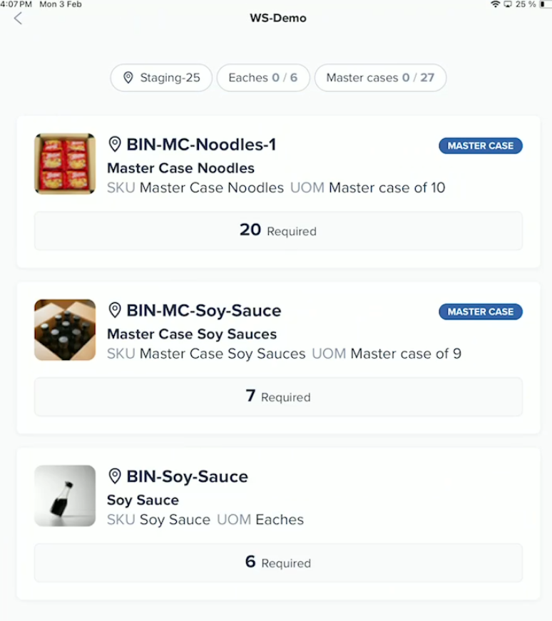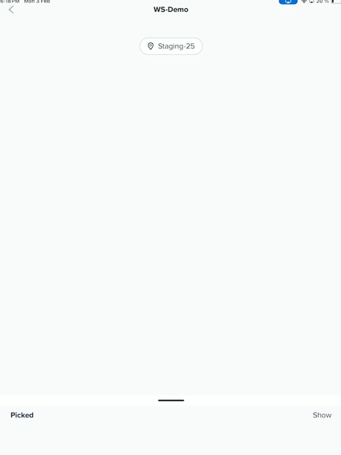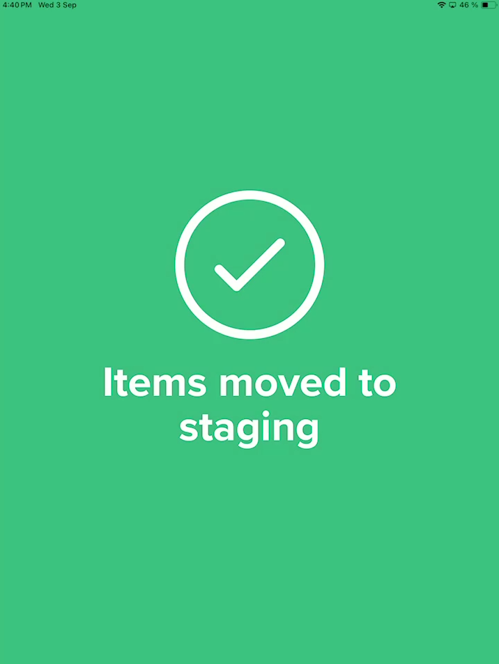 When all required units of a SKU are picked, the line auto‑transfers to the selected Staging location and is marked as picked. In the mobile app you will receive a confirmation page Items moved to staging.
