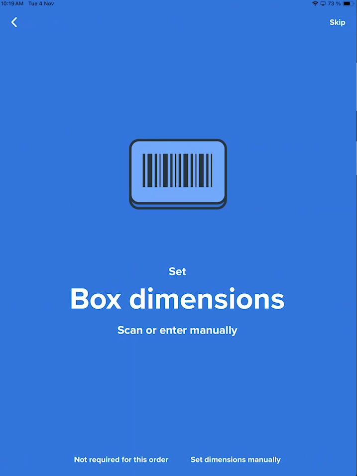 - To set the dimensions: scan the barcode of the box (if it has one), or select a package type from the list of available boxes by choosing Set dimensions manually. For boxes to show in the list they must be created in the Shipping > Boxes page.
