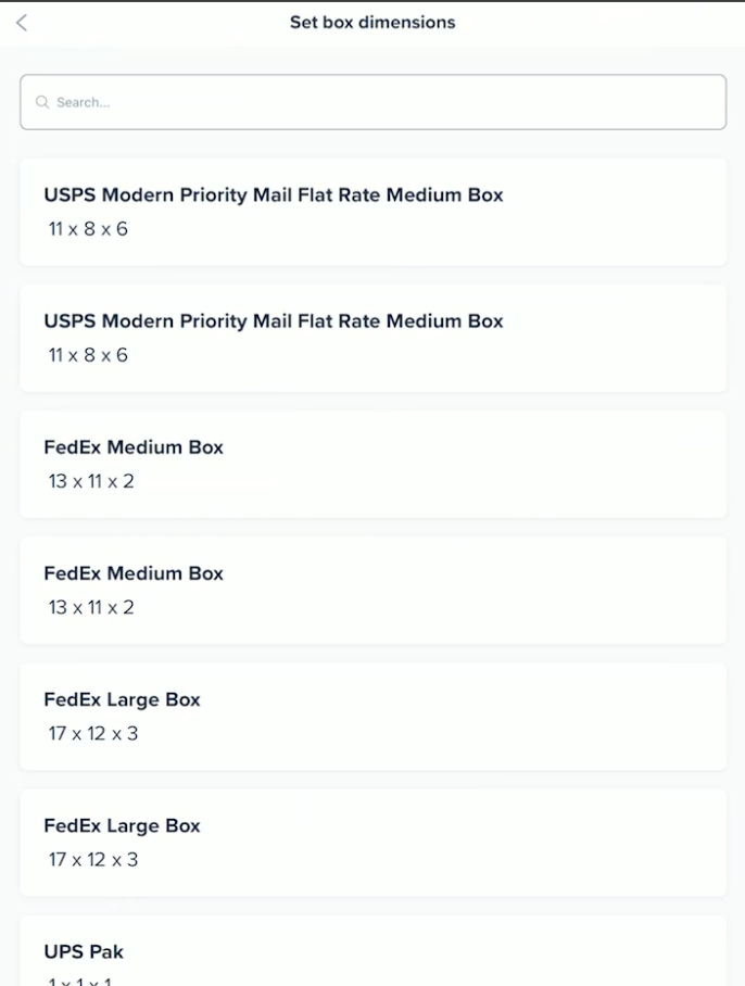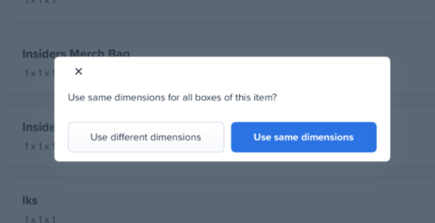 | Box Dimensions Screen | Box List | Use same box dimensions? |