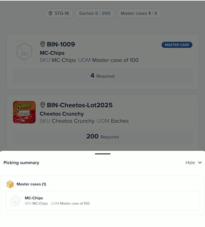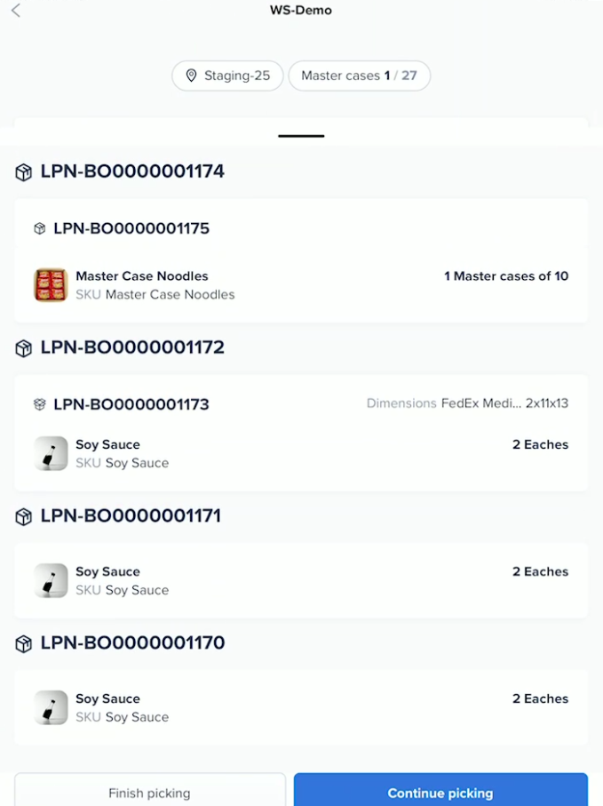 - Inventory Assignment: Upon completion of the picking process, regardless of the picking flow, all picked inventory will be transferred to the staging location selected.