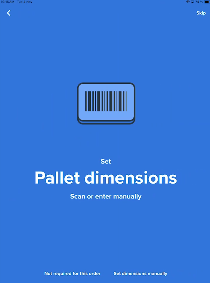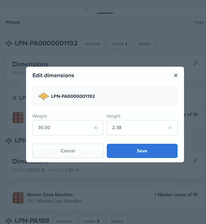 | Scan Pallet LPN Screen | Set Pallet Dimensions |