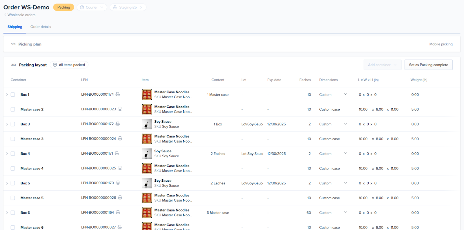 Once all is complete, the wholesale order will move into the Packing status in the Wholesale page. Here the manager can review all the picked/packed inventory and make any necessary modifications.