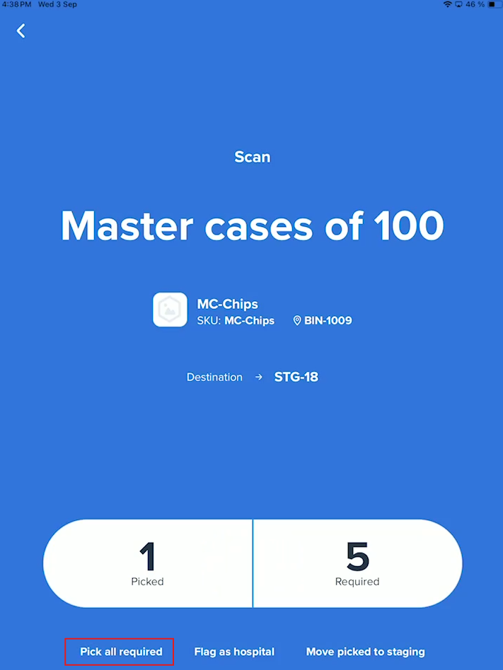 3b. Continue to scan 1 by 1, or click the Picked number and manually select the amount you want to pick. If you want to pick all quantities and move them to the staging location, you can choose Enter all required