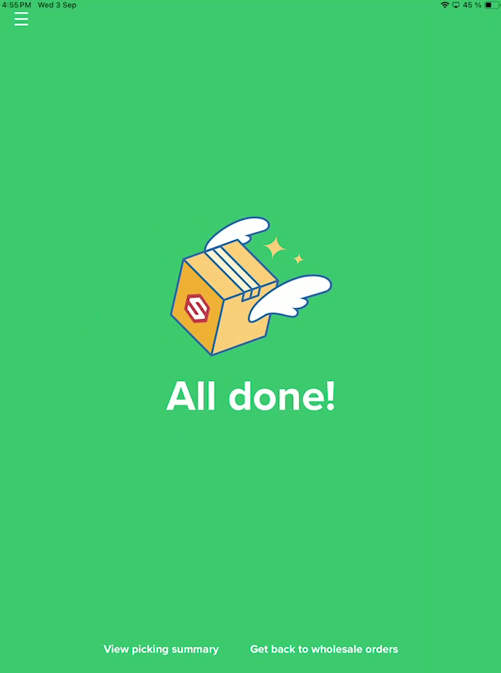4. When you finish, you’ll see a confirmation screen that your picking was completed successfully, and the order will move to the Packing status in the Wholesale page. The inventory picked will be available at the selected staging location for packing.
