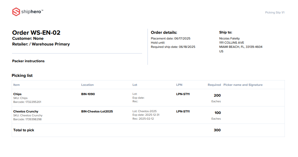 - All LPNs that will be used during mobile picking must be generated in advance from Inventory & Locations > LPNs. For more information, you can check the following article Managing License Plate Numbers in ShipHero.