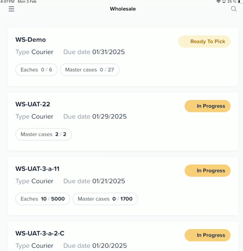 To start either mobile process, the user will navigate to the Order > Wholesale page in the ShipHero Mobile App. Here they are presented with a list of all orders available for picking (either by assignment or because there are locations without an assigned picker).