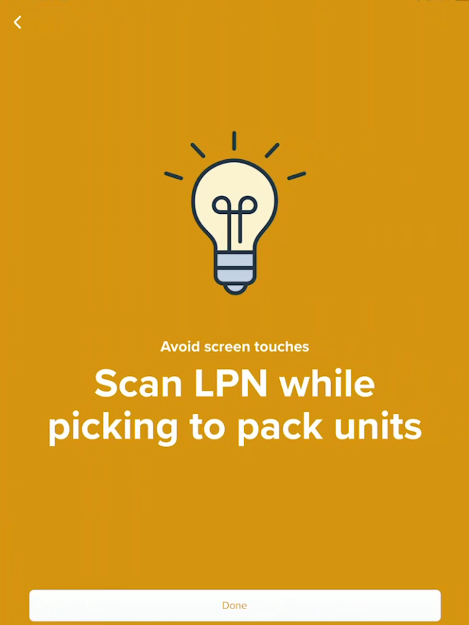 4. Assign the picked inventory to inner and outer boxes using LPNs. The first time you try to pack picked units, you will see an information screen appear with instructions on how to avoid screen touches. (See image below)