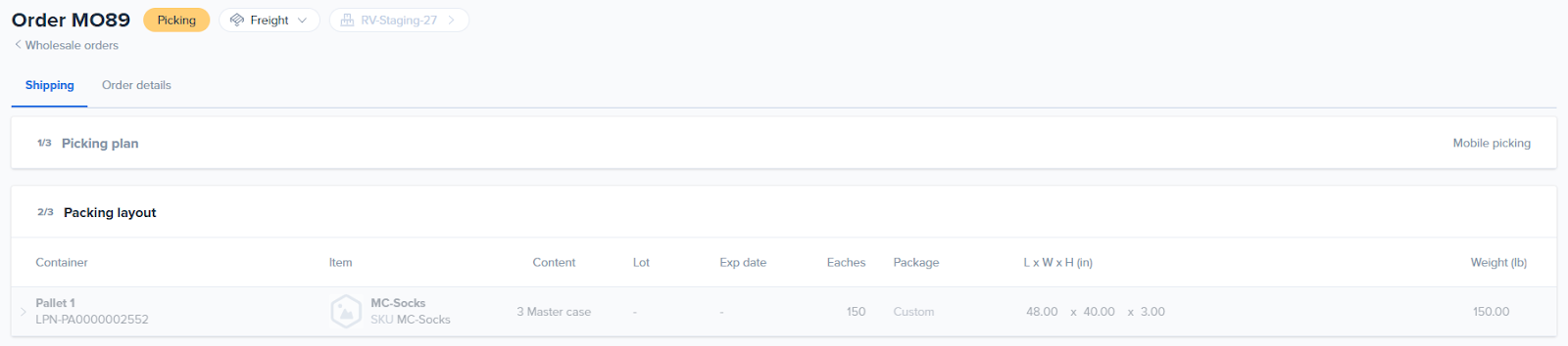 The key difference between freight and courier is that in the Freight flow, Inner and Outer boxes become optional, and the final level of packing must be a Pallet LPN. All other picking and packing steps, as outlined in the Courier flow, remain the same.