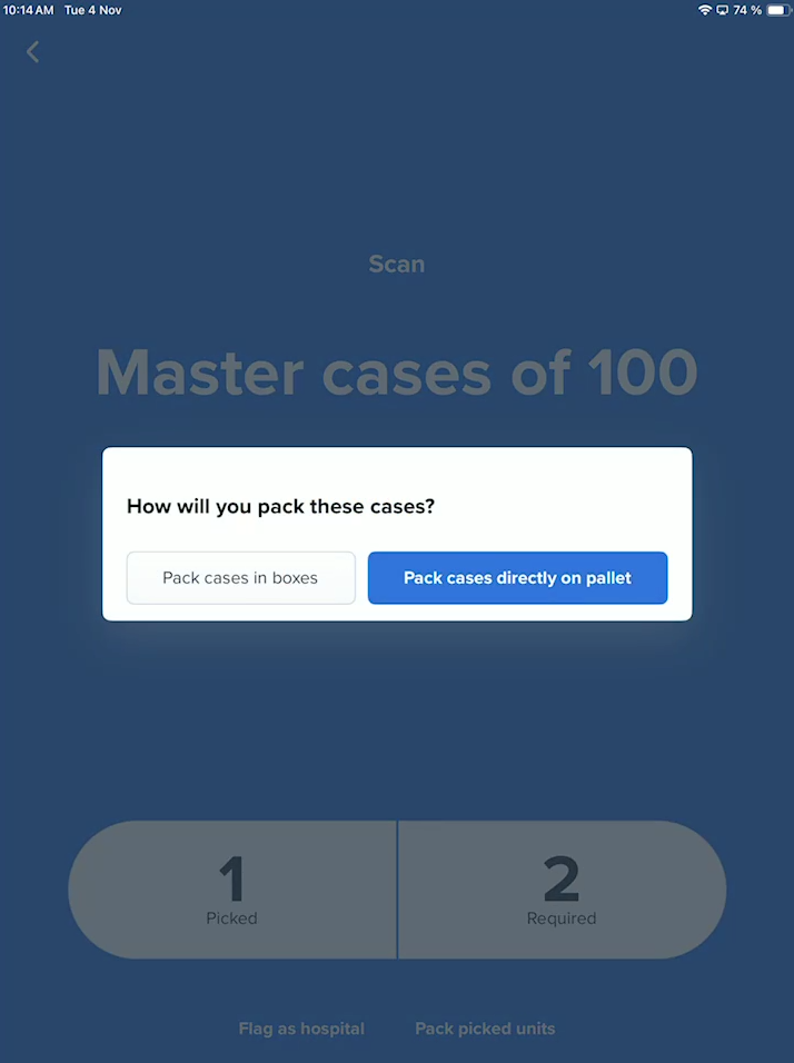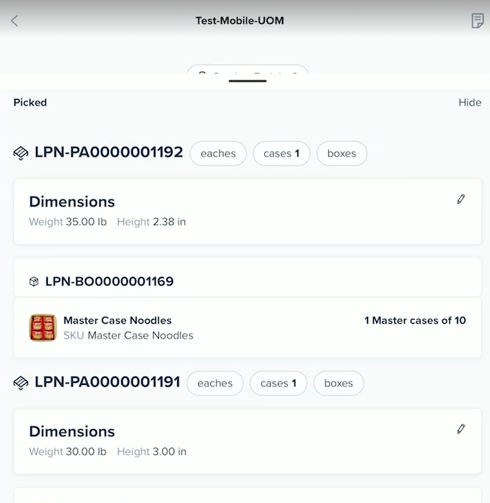 - If you need to split the picks for this product in multiple boxes and tap Pack pick units to put the picked units inside a box or directly scan a BOX LPN.