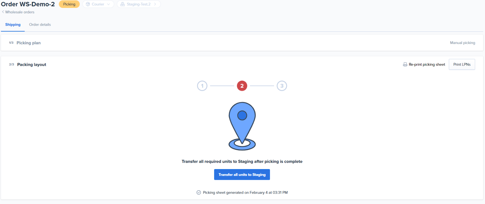When you choose the Picking flow, any inventory you pick is transferred to the selected staging location once it's picked. This is ideal when you want to consolidate at a packing station later.