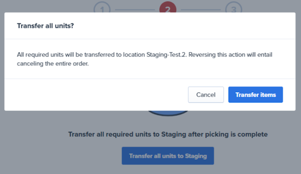 | Transfer all units to Staging | Transfer all units? Confirmation page |